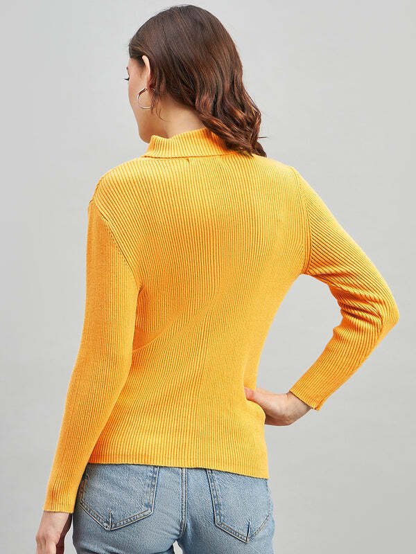 Ribbed High Neck Pullover Sweater-MUSTARD